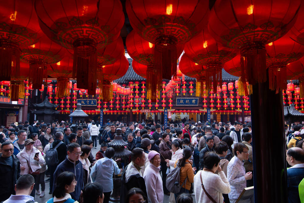 2026年2月20日,上海,市民在城隍庙焚香祈福。传统民俗中,农历新年初五为“财神日”,图为节日期间民众进行祈福活动的场景。 视觉中国 图