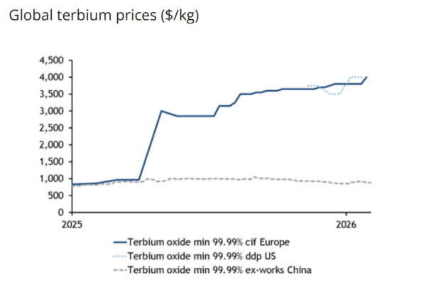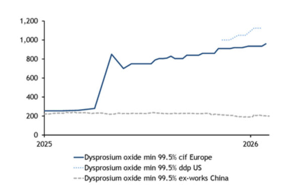 国际能源及大宗商品价格评估机构阿格斯的媒体部门发布数据显示,在欧洲市场,镝价已涨至每公斤960美元,铽价为每公斤4000美元。