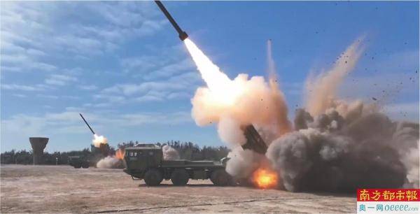昨日,多台远程箱式火箭炮听令发射,数十枚火箭弹呼啸而出,对台岛北部预定海域进行火力打击。 央视截图