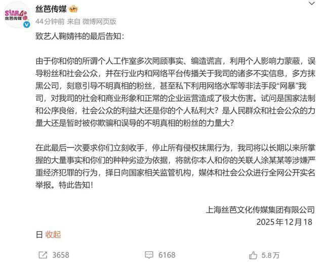 12月18日,丝芭传媒发布“致艺人鞠婧祎的最后告知”,文中提到,在此最后一次要求你们立刻收手,停止所有侵权抹黑行为,我司将以长期以来所掌握的大量事实和你们的种种劣迹为依据,将就你本人和你的关联人涂某某等涉嫌严重经济犯罪的行为,择日向国家相关监管机构,媒体和社会公众进行全网公开实名举报。特此告知。