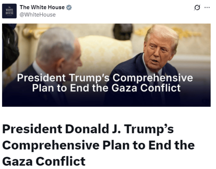 根据白宫公布的文件,特朗普就结束加沙冲突提出的“全面解决加沙冲突计划”共计20条,具体包括: